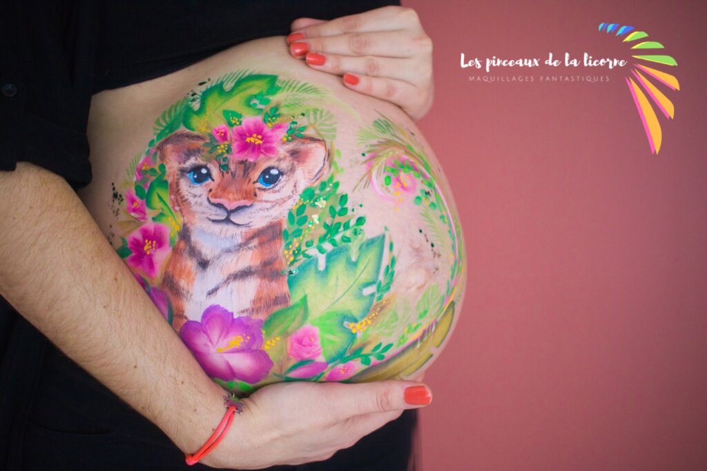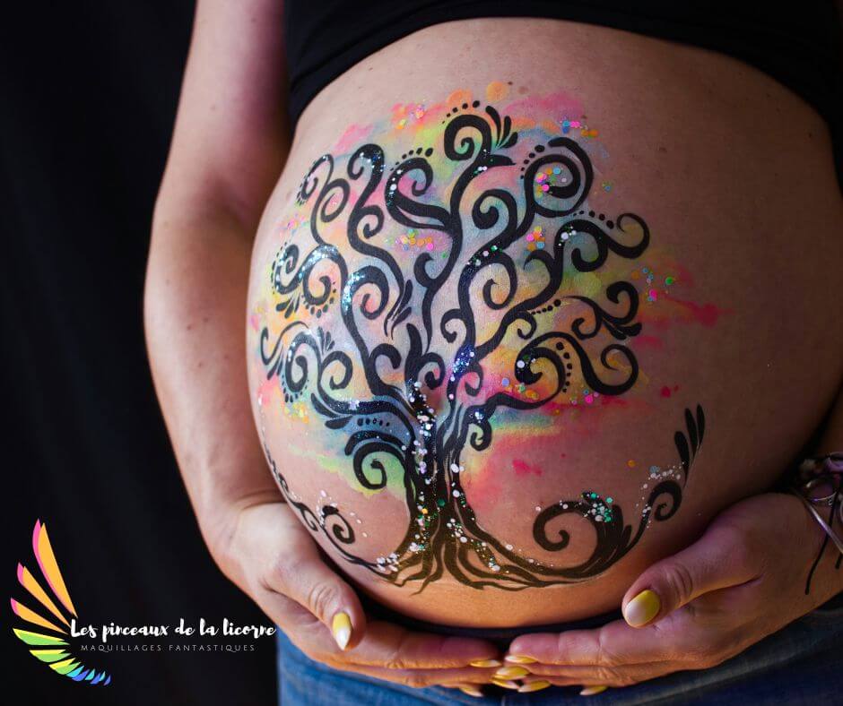 Le maquillage prénatal : une œuvre colorée sur ventre rond